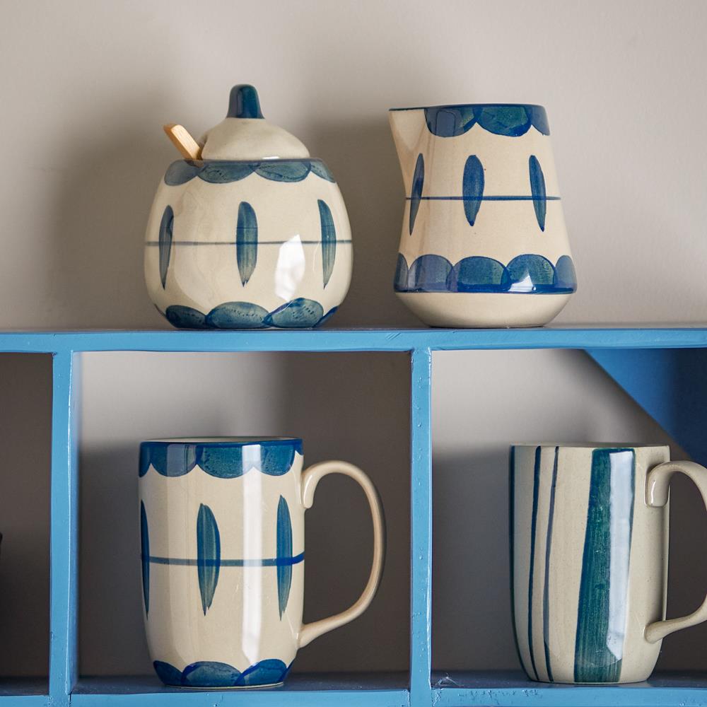 Das Allium Set überzeugt mit handdekoriertem Steingut und einem organischen, dunkelblauen Muster, das jedem Teil eine lebendige, natürliche Ausstrahlung verleiht. Milchkännchen und Zuckerdose harmonieren perfekt und bringen stilvolle Eleganz auf den gedeckten Tisch – ideal für Kaffee, Tee oder als dekoratives Element in der Küche.