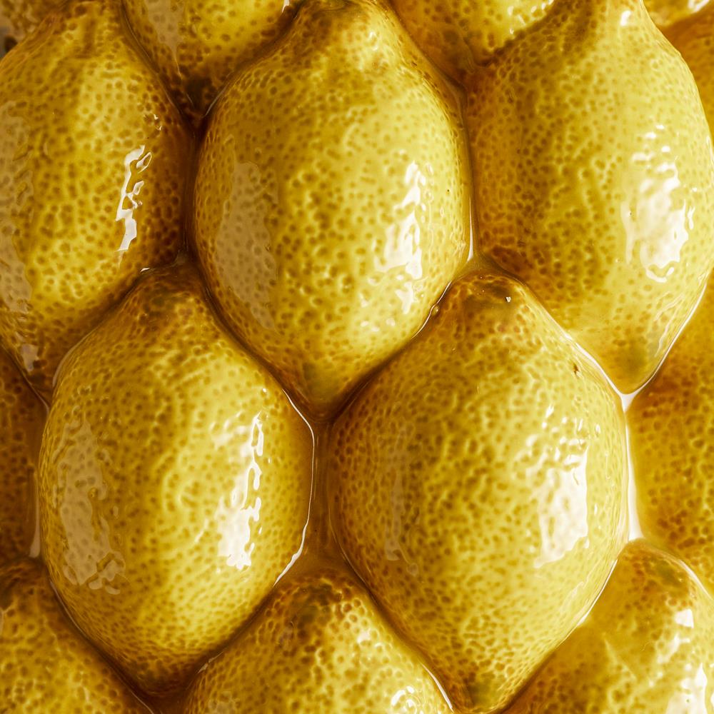 Die Limone Vase vereint einen warmen Gelbton mit detailreich gestalteten Zitronen und sorgt so für einen starken, fröhlichen Akzent im Raum. Mit ihrer bauchigen Form setzt sie Blumensträuße ebenso wie einzelne Zweige perfekt in Szene.