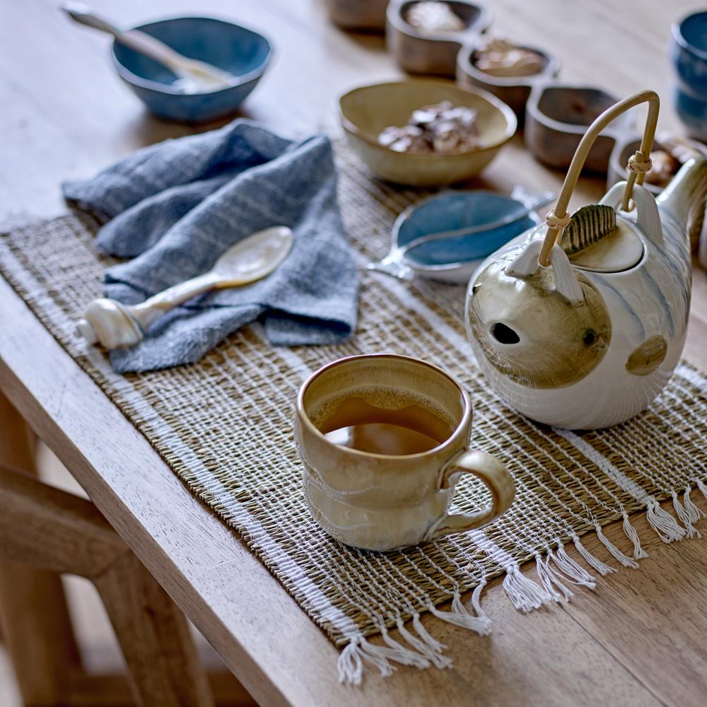 Die Wrenna Teekanne ist in einer verspielten Fischform gestaltet und bringt maritimen Charme auf den Tisch. Gefertigt aus Steingut und mit einem Griff aus Naturmaterial versehen, ist sie ein außergewöhnlicher Blickfang für Teeliebhaber und Fans besonderer Keramik.