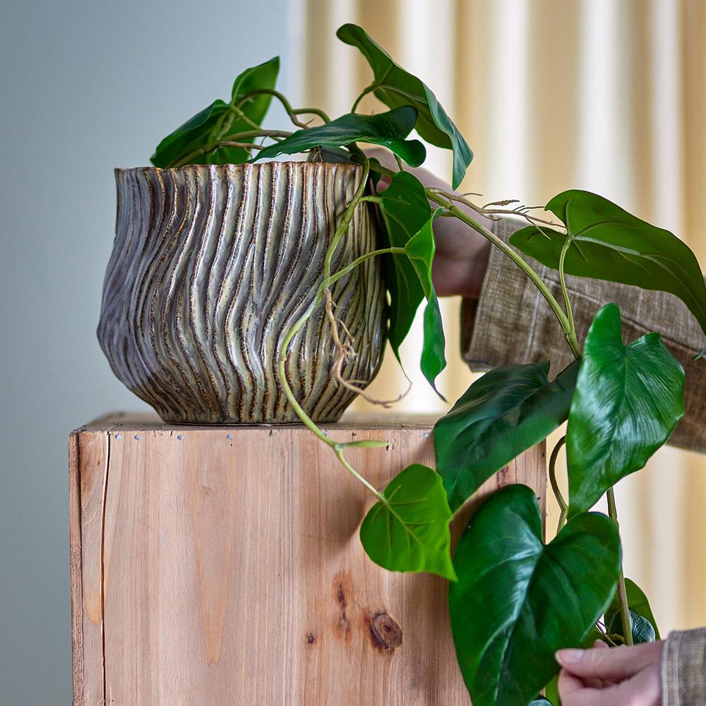 Der Dua Blumentopf von Bloomingville ist ein stilvoller Hingucker für jedes Zuhause. Mit seiner organischen Linienführung und der strukturierten Oberfläche bringt er Bewegung und Tiefe in deine Einrichtung. Die grüne Glasur mit ihrem lebendigen Farbspiel unterstreicht das natürliche Muster und macht jeden Topf zu einem Unikat. Farbvariationen sind gewollt und Teil des handwerklichen Charmes.