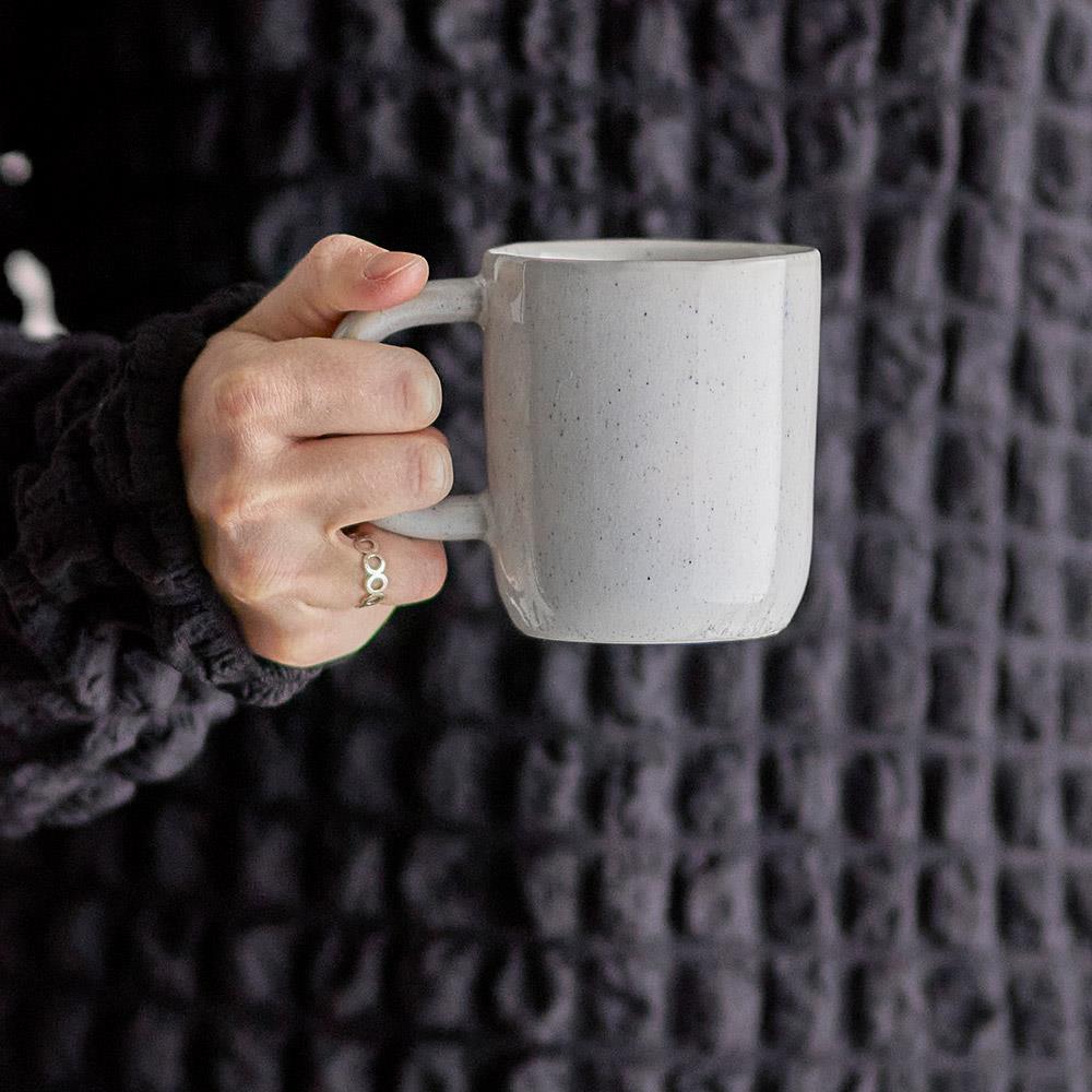• Hochwertige Steinguttasse mit weißer Sprenkelglasur