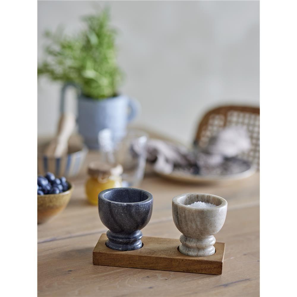 Das Inesa Salz- und Pfefferstreuer von Bloomingville ist ein schönes und praktisches Set, bestehend aus zwei Marmordosen für Salz und Pfeffer. Eine Dose besteht aus dunkelgrauem Marmor und die andere aus hellem Marmor, was einen schönen Kontrast auf dem Tisch schafft. Beide Dosen stehen auf einem einfachen Holztablett, das einen natürlichen und gemütlichen Eindruck vermittelt.