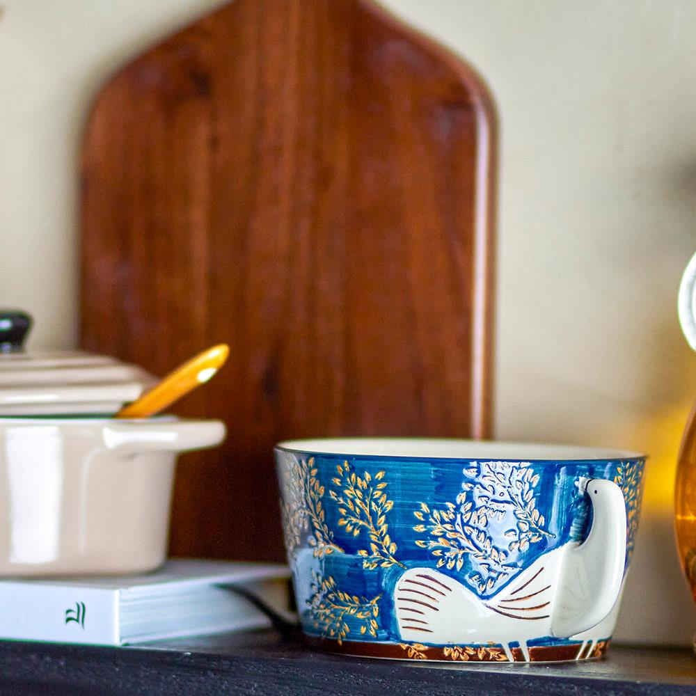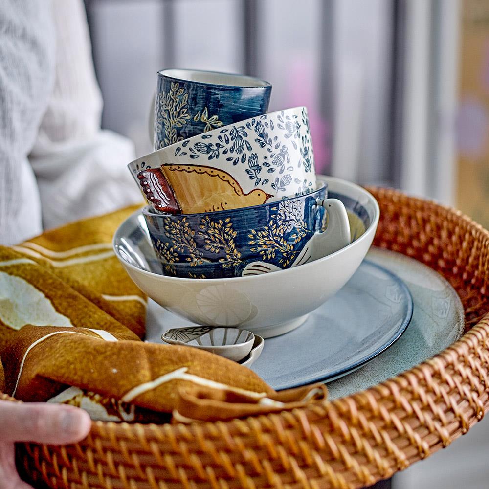 Bloomingville Hezha Schale Blau – Handbemalte Steingutschale mit Vogelmotiv, 460 ml