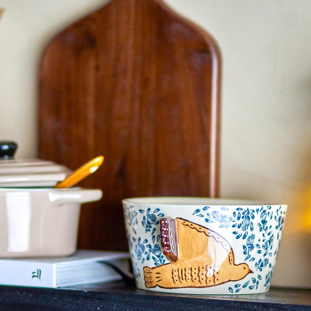 Bloomingville Hezha Schale Natur – Handbemalte Steingutschale mit Vogelmotiv, 460 ml