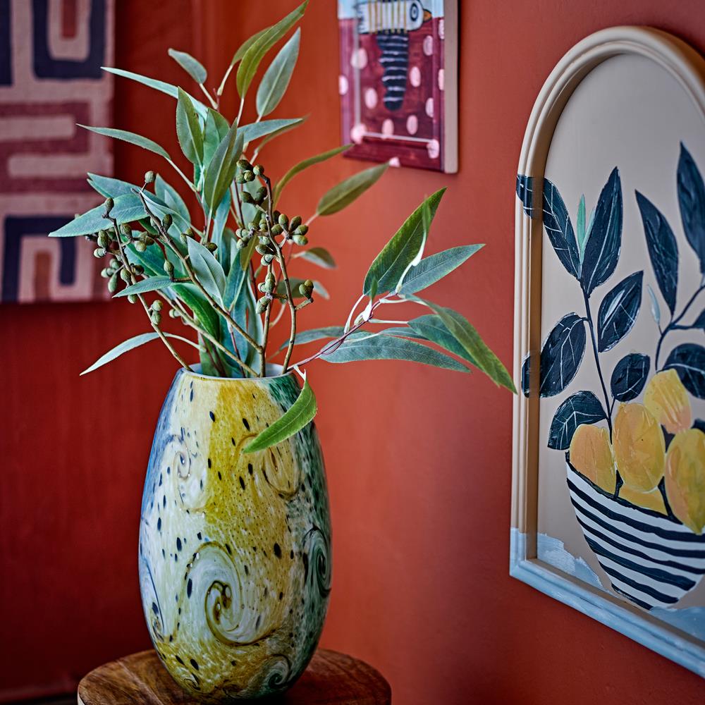 Die Kalian Vase ist ein dekoratives Glasobjekt, das durch sein mundgeblasenes Muster hervorsticht. Jede Vase zeigt leichte Variationen in Farbe und Struktur, wodurch sie ein echtes Einzelstück ist.