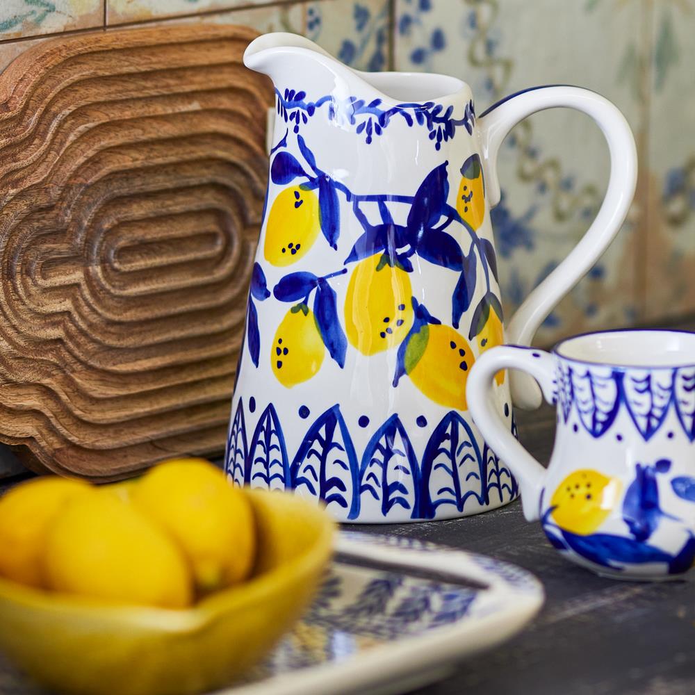 Der Maxima Krug setzt mit seinen handbemalten Zitronen und blauen Blättern einen mediterranen, frischen Akzent auf jedem Tisch. Die leuchtenden Farben erinnern an sommerliche Urlaubsmomente und machen ihn zum Highlight deiner Tischdekoration.