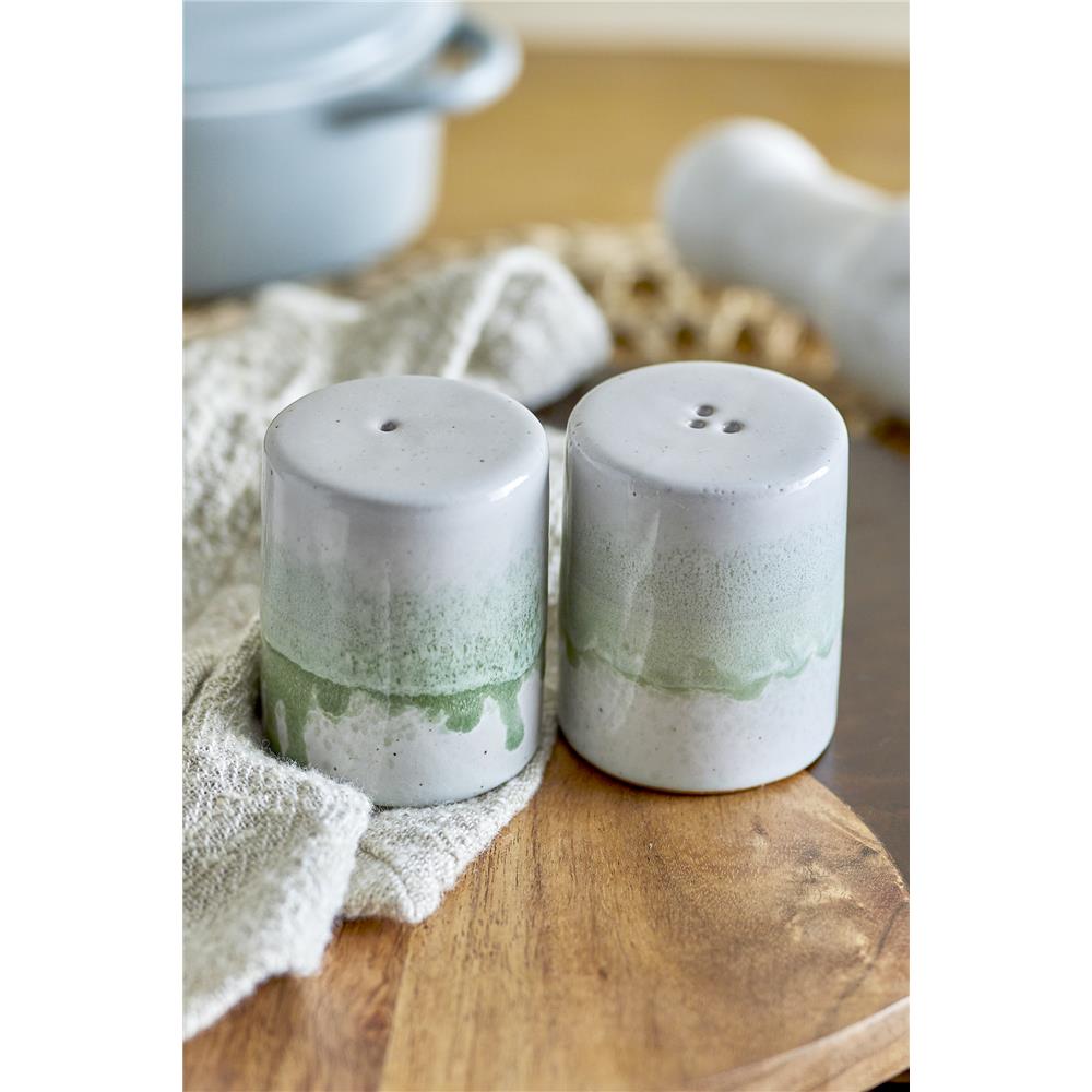 Das Paula Salz- und Pfefferset von Bloomingville ist Teil der umfangreichen Paula Geschirrserie, hier in einer frischen weiß-grünen Farbkombination. Aufgrund der Natur der Glasur wird jedes Stück variieren und ein Unikat sein.
