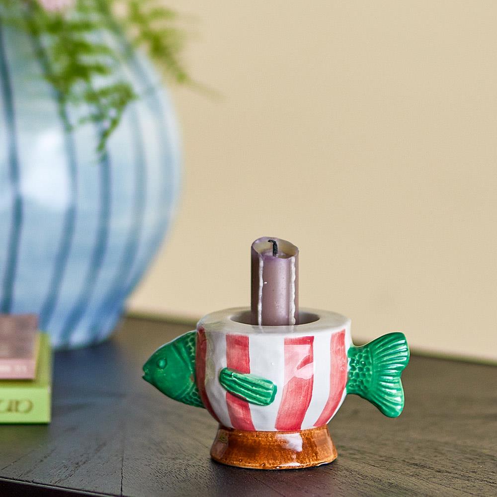 Der Codia Kerzenhalter von Bloomingville ist ein echter Hingucker mit Charakter. In Form eines verspielten Fisches gestaltet und liebevoll handbemalt, bringt er Farbe und Humor in dein Zuhause. Die Kombination aus pinker Grundfarbe, roten und weißen Streifen sowie grünen Details verleiht dem Kerzenhalter eine lebendige Ausstrahlung. Ob auf dem Tisch, der Fensterbank oder als originelles Detail in deiner Tischdekoration – der Codia Kerzenhalter sorgt für eine gemütliche Atmosphäre und ein Lächeln im Gesicht.