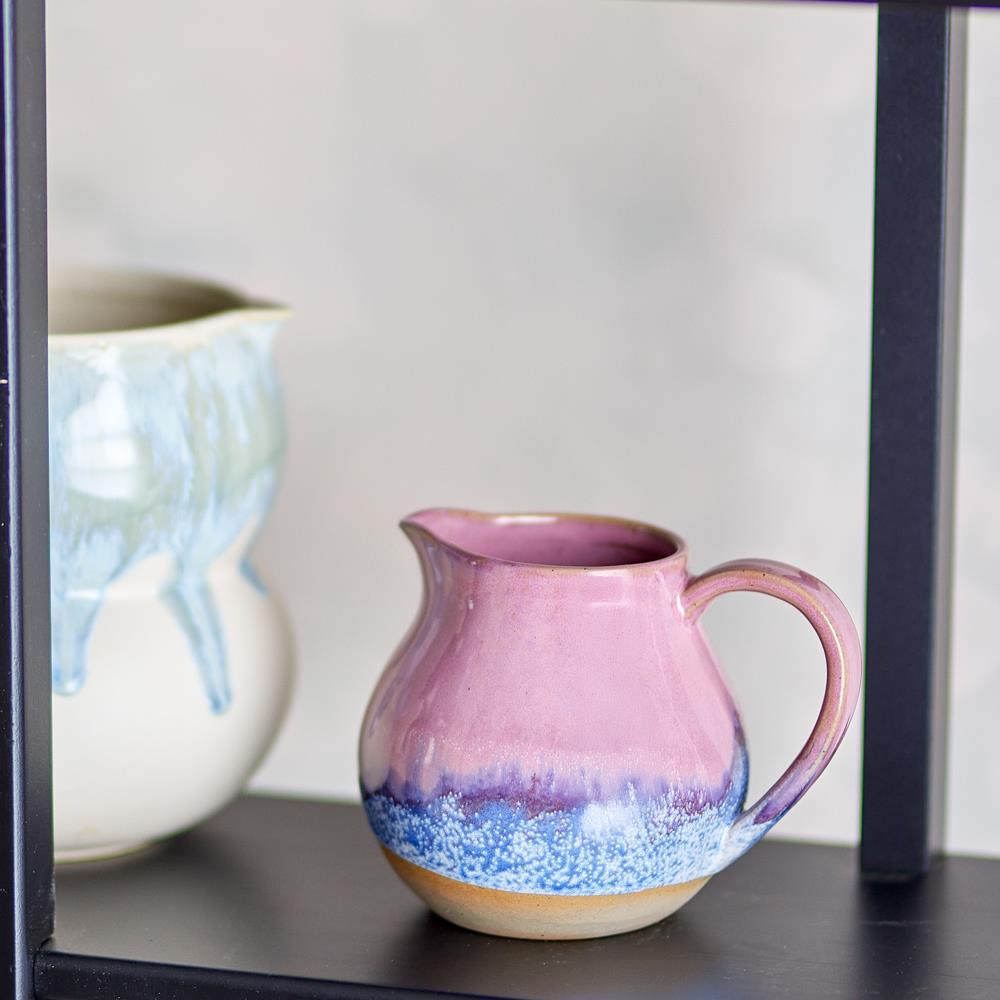 Die rosafarbene Variante verbindet Rosa‑ und Blaunuancen zu einem lebendigen, freundlichen Farbspiel. Der Krug wirkt dekorativ auf dem Tisch und eignet sich ebenso gut als kleines Blumengefäß wie zum Servieren.