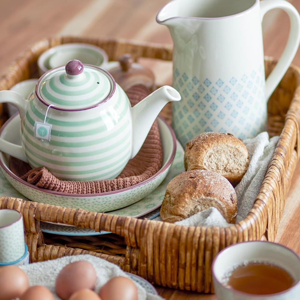 Der Sonntagsbrunch wird mit dem Bloomingville Patrizia Eierbecher 3er Set zu einem stilvollen Ereignis. Diese Keramikschönheiten aus der Patrizia-Kollektion von Bloomingville kommen mit einem lebhaften Muster aus Streifen, Blumen und Punkten, das Ihrem Küchentisch einen charmanten Retro-Look verleiht.
