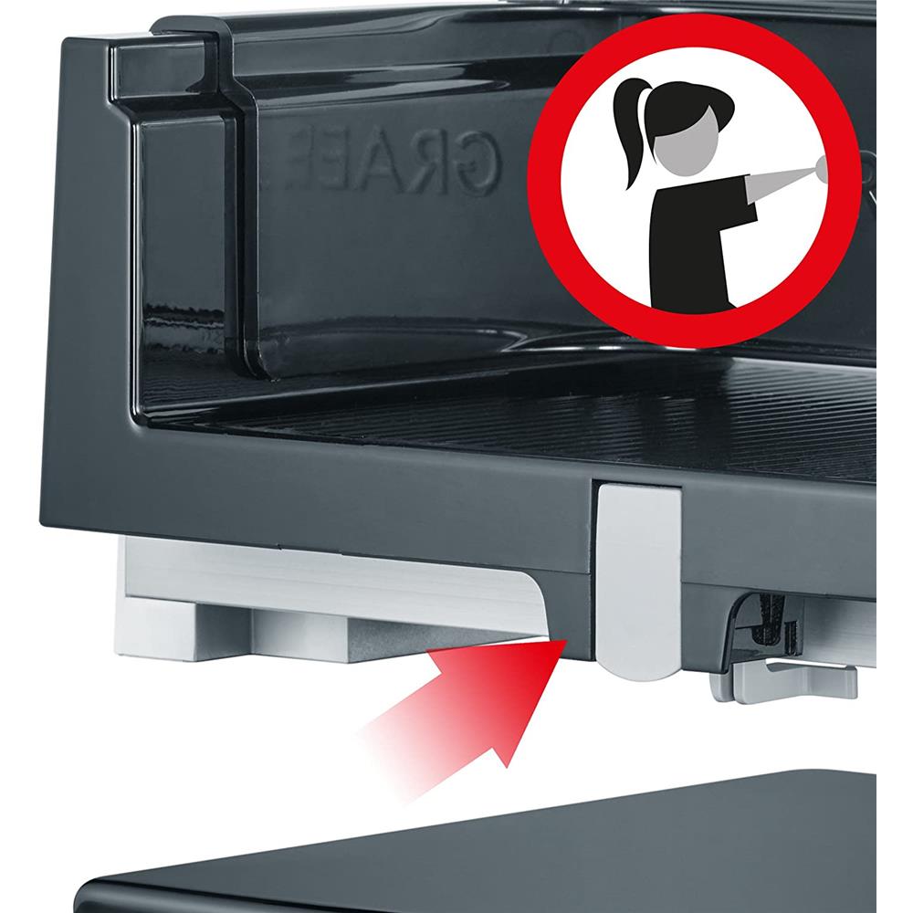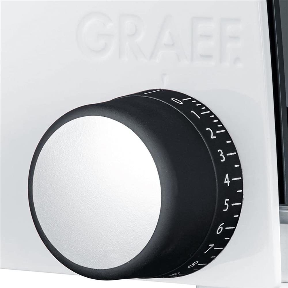 Der Allesschneider verfügt über einen 45-Watt-Energiesparmotor mit einer Spitzenschneidleistung von bis zu 170 Watt. Schneiden Sie energiesparend – ohne dabei auf die bewährte Leistungskraft einer Graef Maschine zu verzichten.