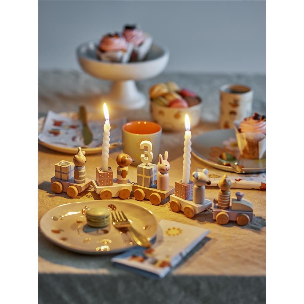 Besonders praktisch: Drei integrierte Kerzenhalter sorgen für stimmungsvolles Licht am Geburtstagstisch. Auch außerhalb der Feierlichkeiten ist der Zug ein bezauberndes Deko-Element im Kinder- oder Spielzimmer. Geliefert wird das Set in einer hübschen Geschenkbox – ideal als Präsent zur Geburt, Taufe oder Babyparty.