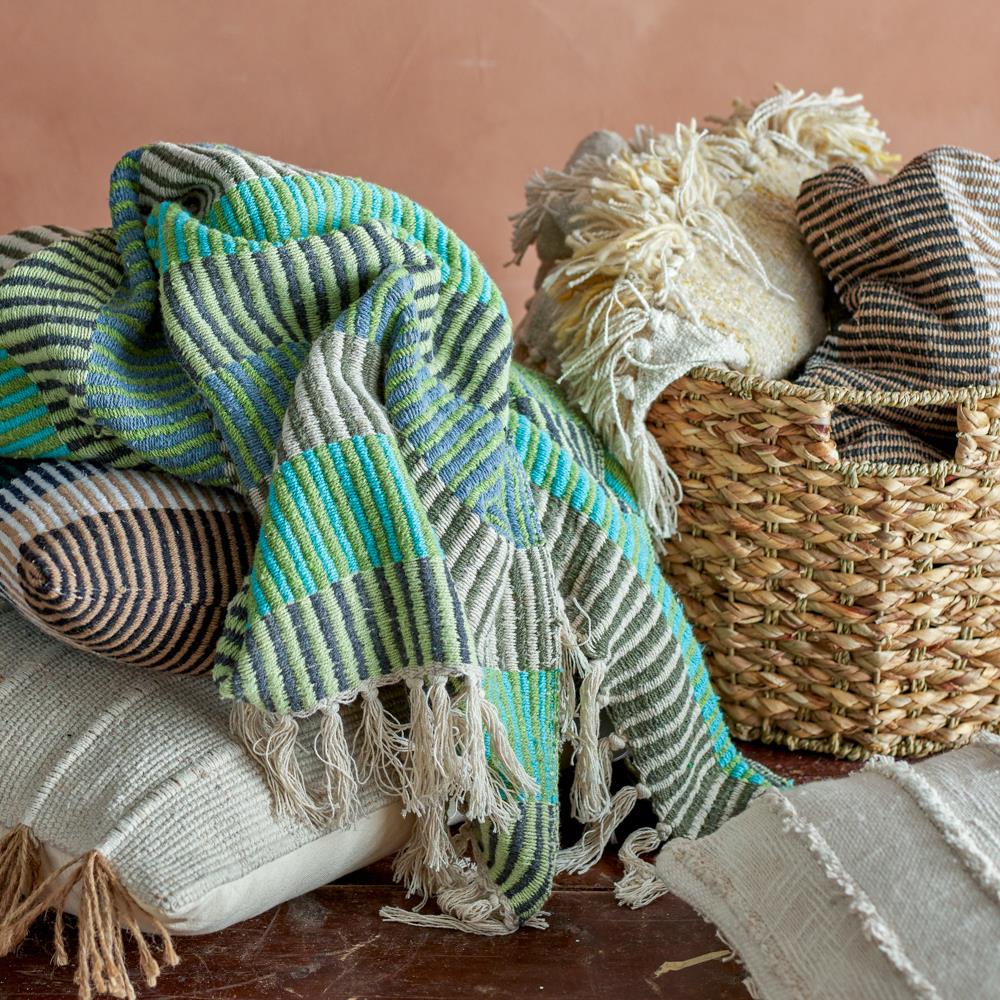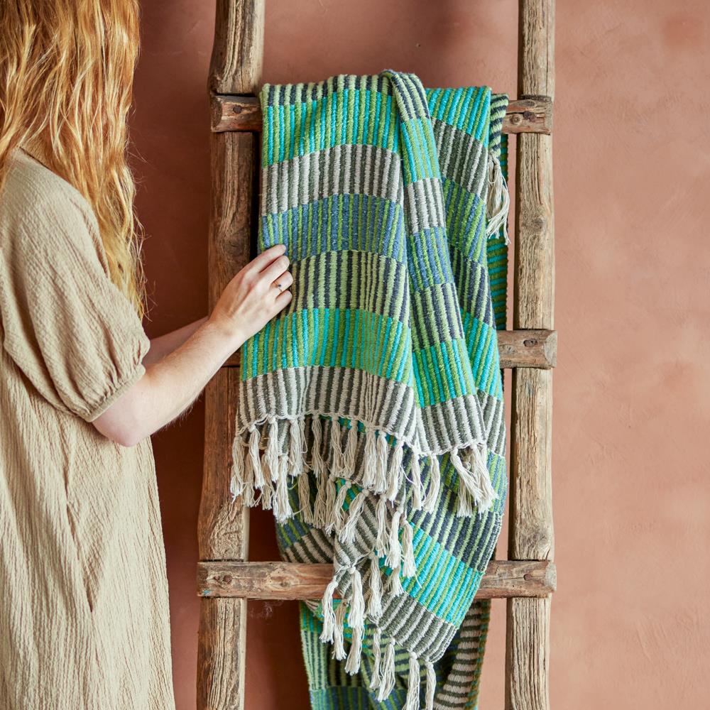 Die Isnel Decke wird aus recycelter Baumwolle gefertigt und vereint grüne, gelbe und graue Streifen zu einem lebendigen, natürlichen Farbspiel. Die weiche Webstruktur und die Fransen an den Enden verleihen ihr eine gemütliche Optik – ideal zum Einkuscheln auf Sofa oder Terrasse.