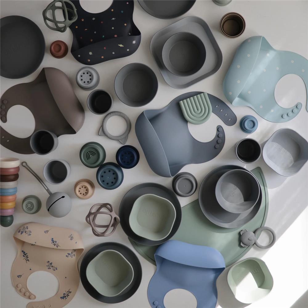 Mushie Silikon-Lätzchen, Powder Blue, mit Auffangschale, BPA-frei